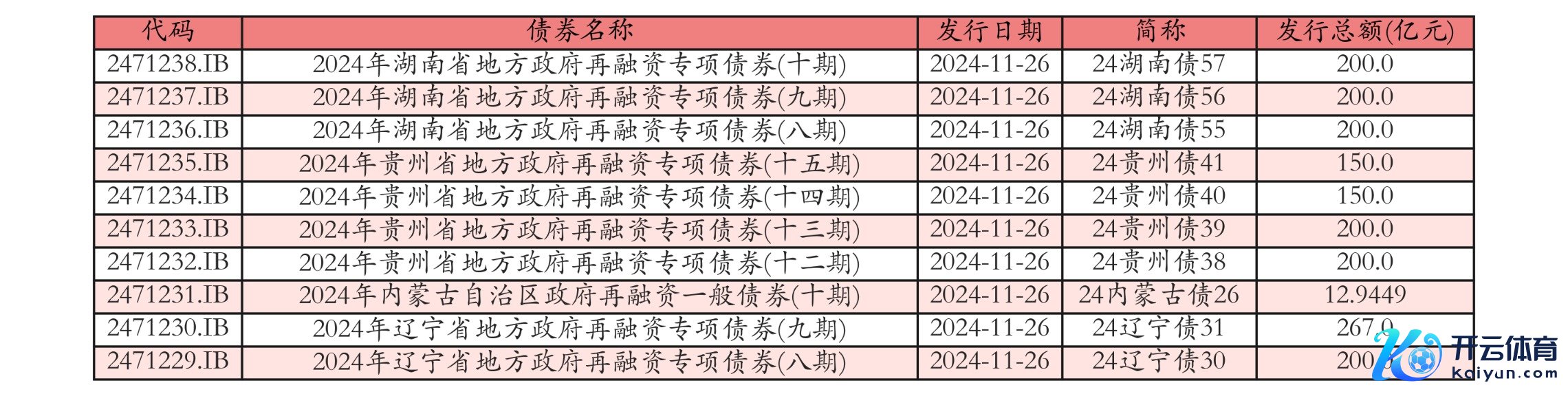 当天刊行场地政府债笃定如下表: kaiyun