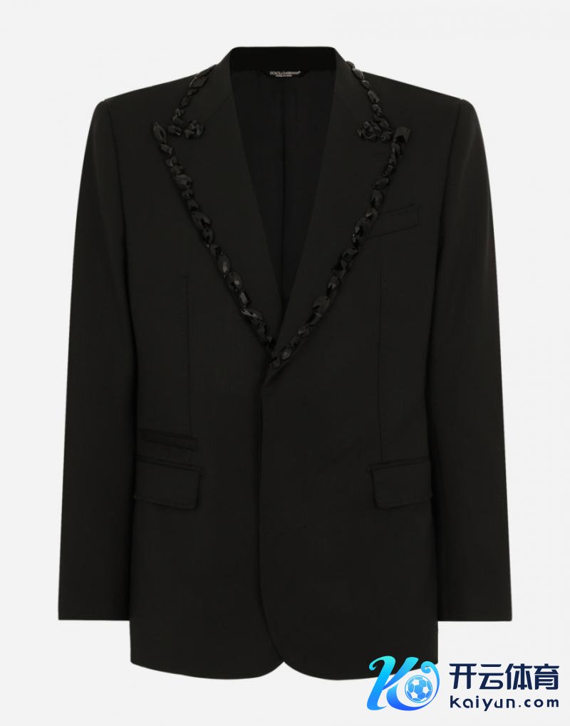 Sicilia水钻梗阻单排扣降服夹克选拔了弹力羊毛面料,联接水钻刺绣的风雅梗阻,不仅展现了杜嘉班纳对亏蚀质感的追求,还将传统的优雅格调与当代筹办理念联接,成为当代男士衣橱中的必备单品。